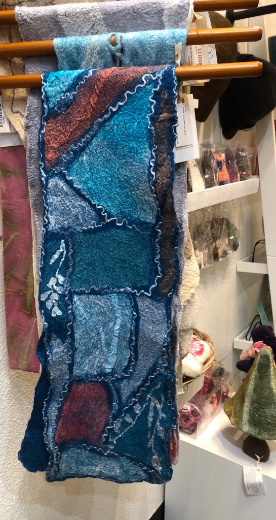 Here’s a new scarf that I just delivered to 4 ravens gallery, in Missoula yesterday. It is a patchwork of hand dyed silk fabrics combined with with fine merino wool.