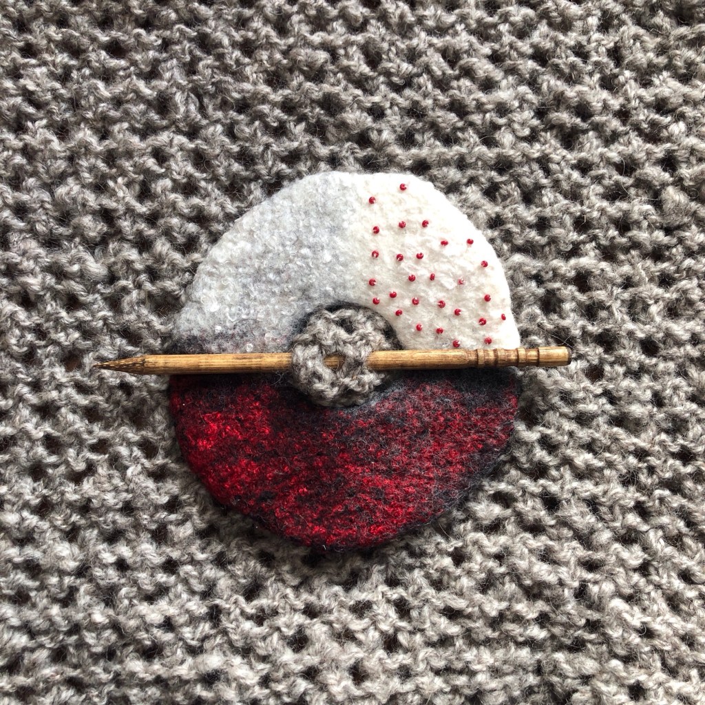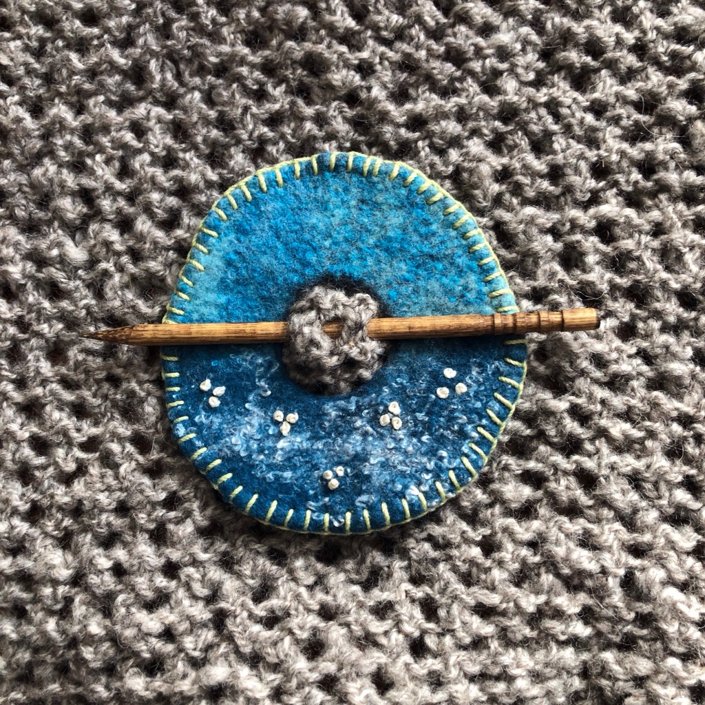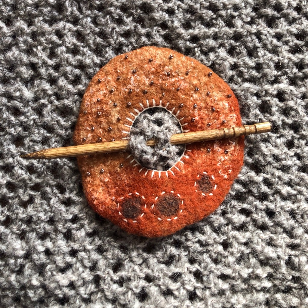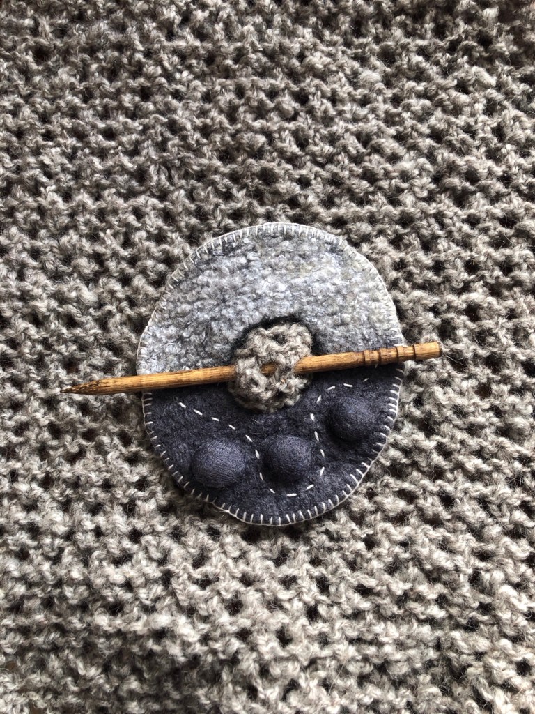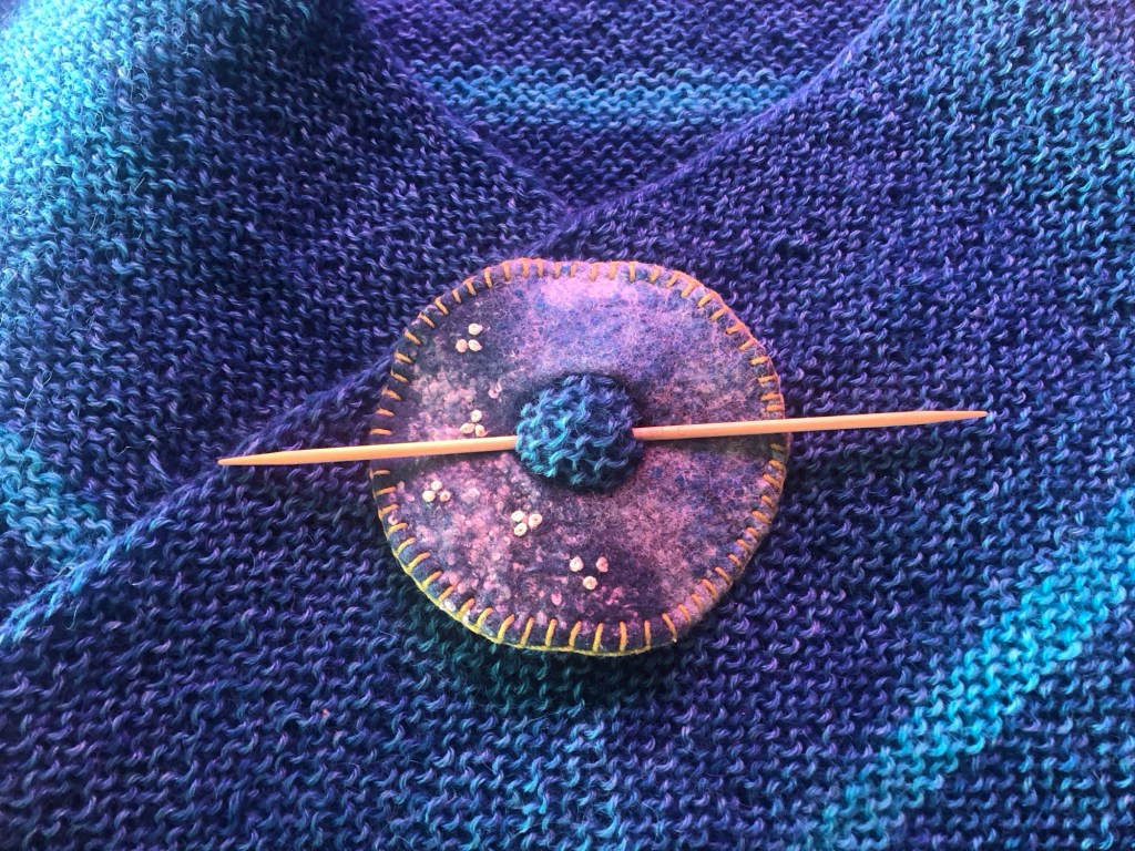 Decided to try my own version of a felt shawl pin this morning. Got the size correct on the second try. Just a bit of simple embellishment on this one but the possibilities are endless. Now to tackle making my own sticks. Will work nicely on this shawl I just finished. My first knitting in quite a few years. Good therapy for the present time.