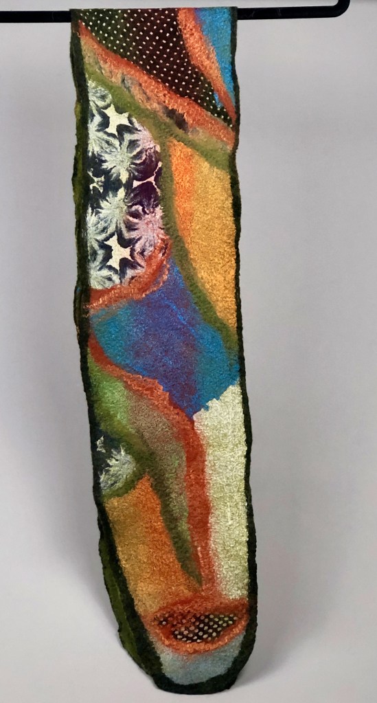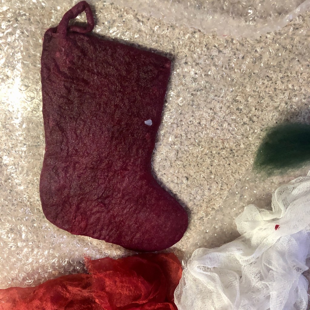 And here’s the finished Stocking. Not quite dry yet. The fabric I created from fine hand dyed wool and silk fabric is very dry but also very strong. Ready to fill with all sorts of little treasures for the holiday.
