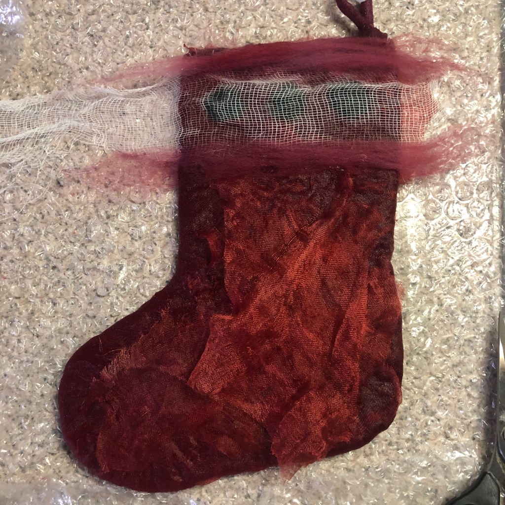 Next I selection the fabrics and fiber I will use for embellishment. For this stocking I chose some green merino wool, cotton scrim and hand dyed red silk gauze.