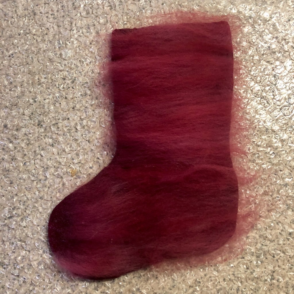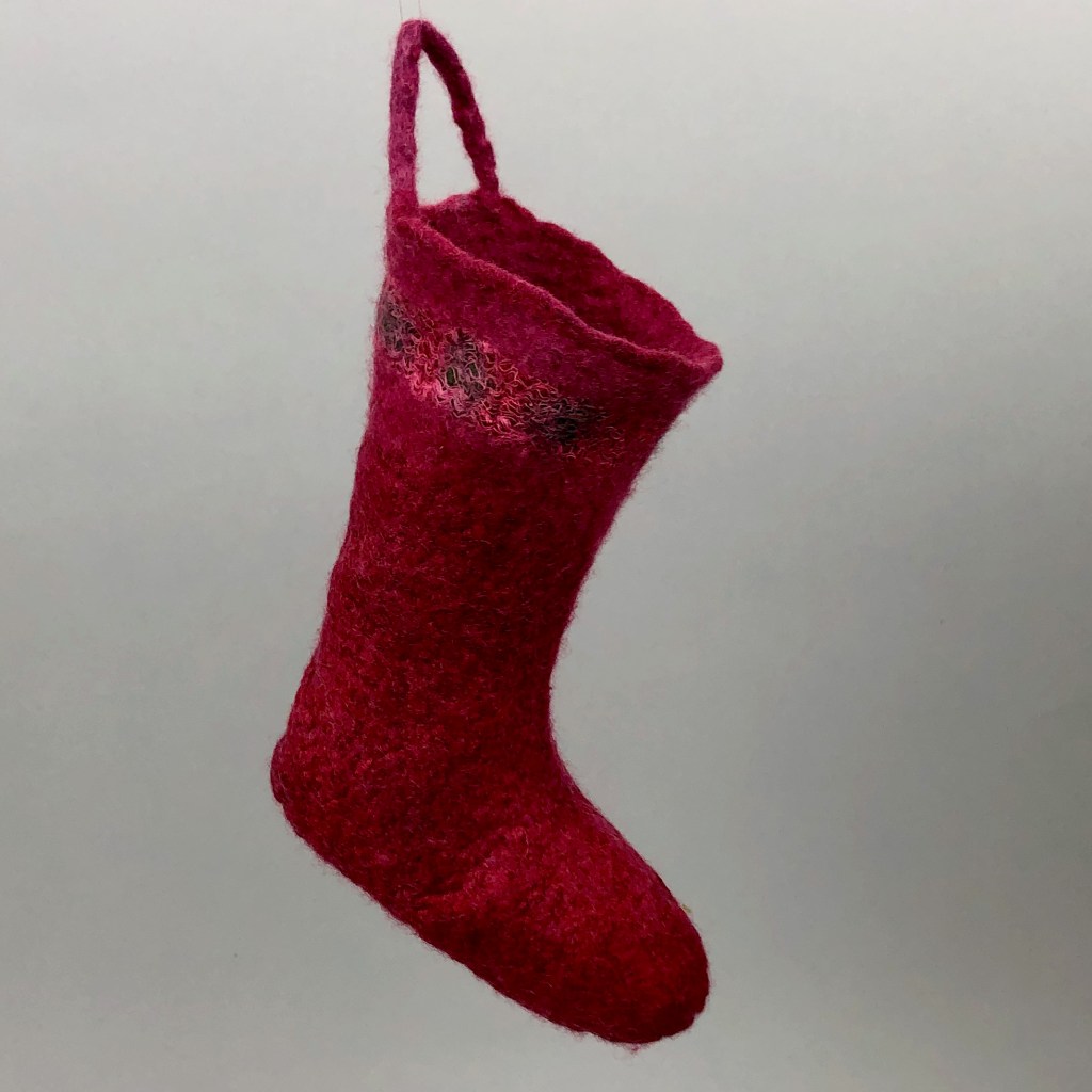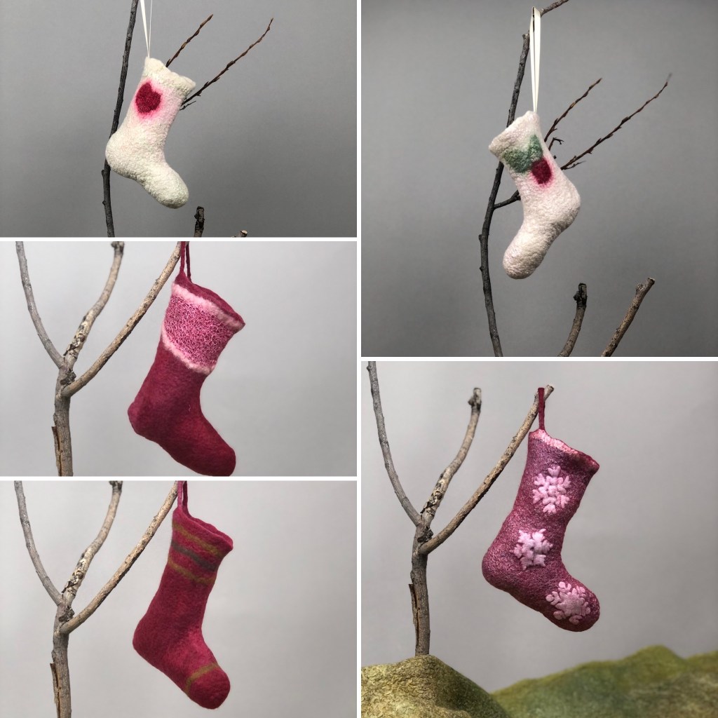 I generally use 4 layers of wool for my ornaments, adding a loop to hang the stocking from. Stockings are so simple and you can make any size from tiny to large.