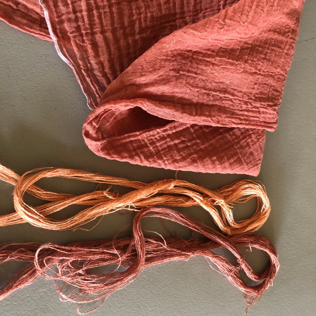 Just finished dyeing some fine linen yarn and cotton scrim with Fiber Reactive Dye. Put the lighter colored skein in at the end of the process and it is actually a nice soft, melon. Will looking forward to adding these to a project in the not to distant future.