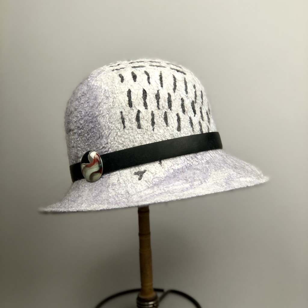 Delivered a couple more hats to 4 Ravens Gallery this past week. Still playing around with adding Sumi Ink to the silk fabric before felting. The burgandy/brown hat is trimmed with black Dupioni Silk fabric. The grey hat has several different hand dyed silk fabrics on the surface, also embellished with Sumi Ink and trimmed with a black leather band and ceramic button.