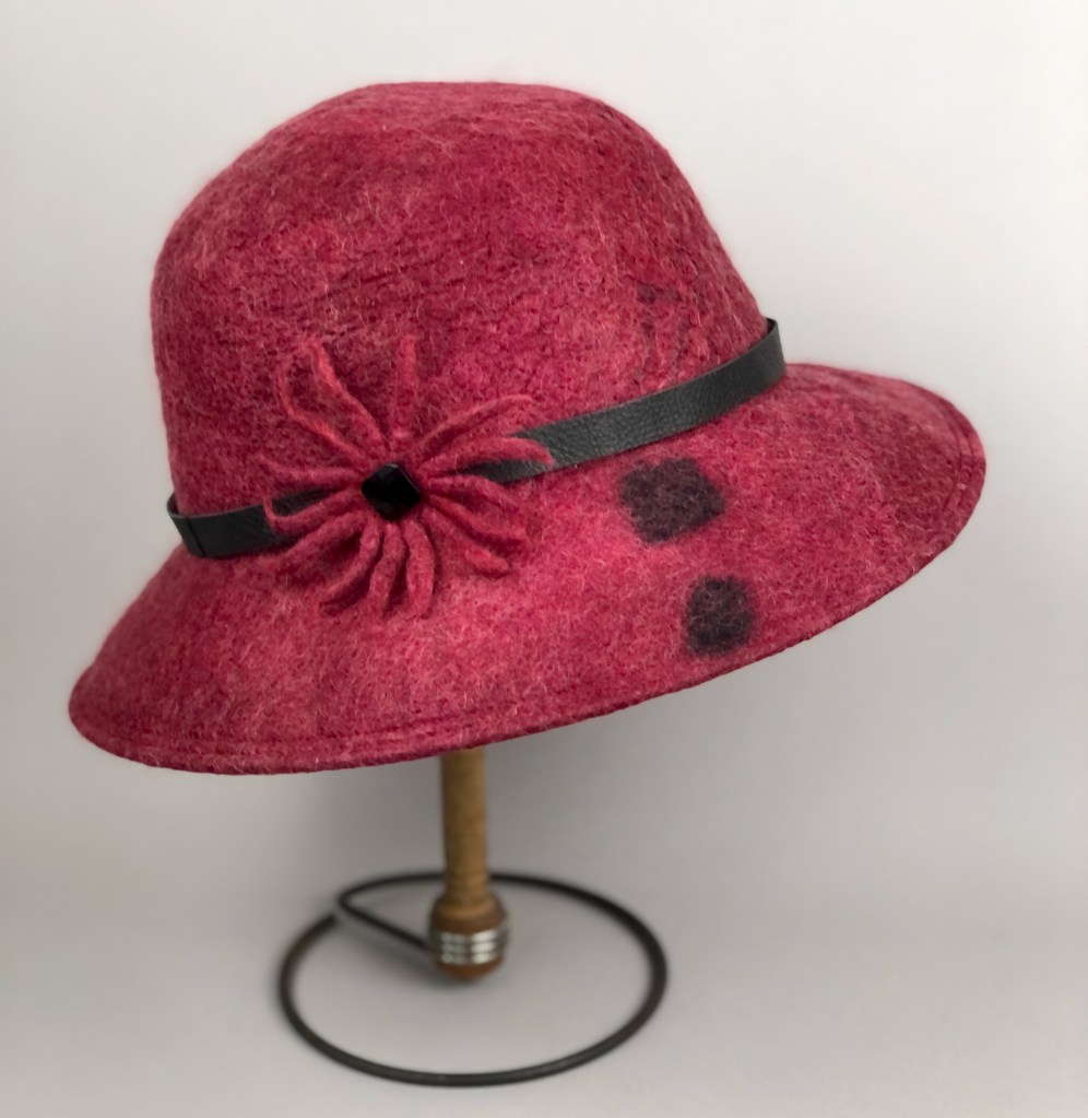 The beautiful Silk Satin Devore incorporated into this felt hat takes it to a higher level. The fabric is repurposed from a beautiful dress I found in a consignment store on a trip to Florida. Not too many silk dresses at consignment stores in western Montana. The trim was inspired by a felt jewelry class I am currently taking from Deb Koesters. Always more to learn.