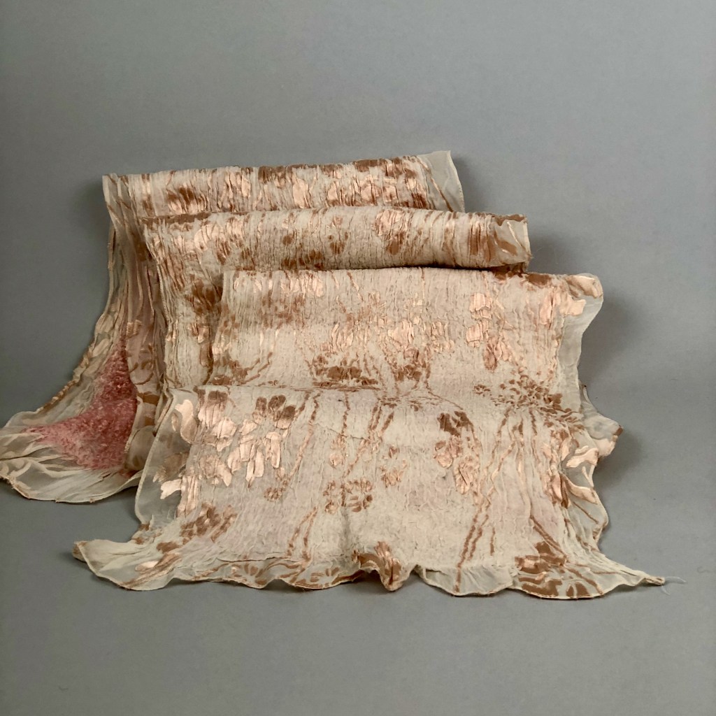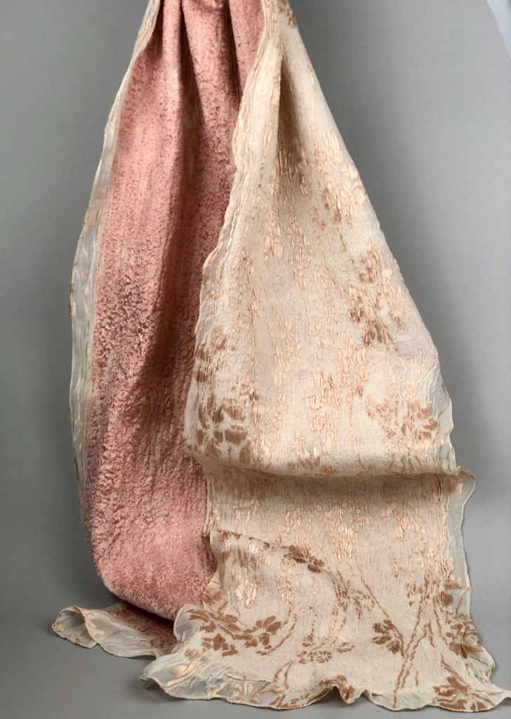 Experimenting with new silk fabrics. My friend, Sue, gifted me some gorgeous textured silk fabric which I dyed terra-cotta. Love the colors and texture in this scarf.
